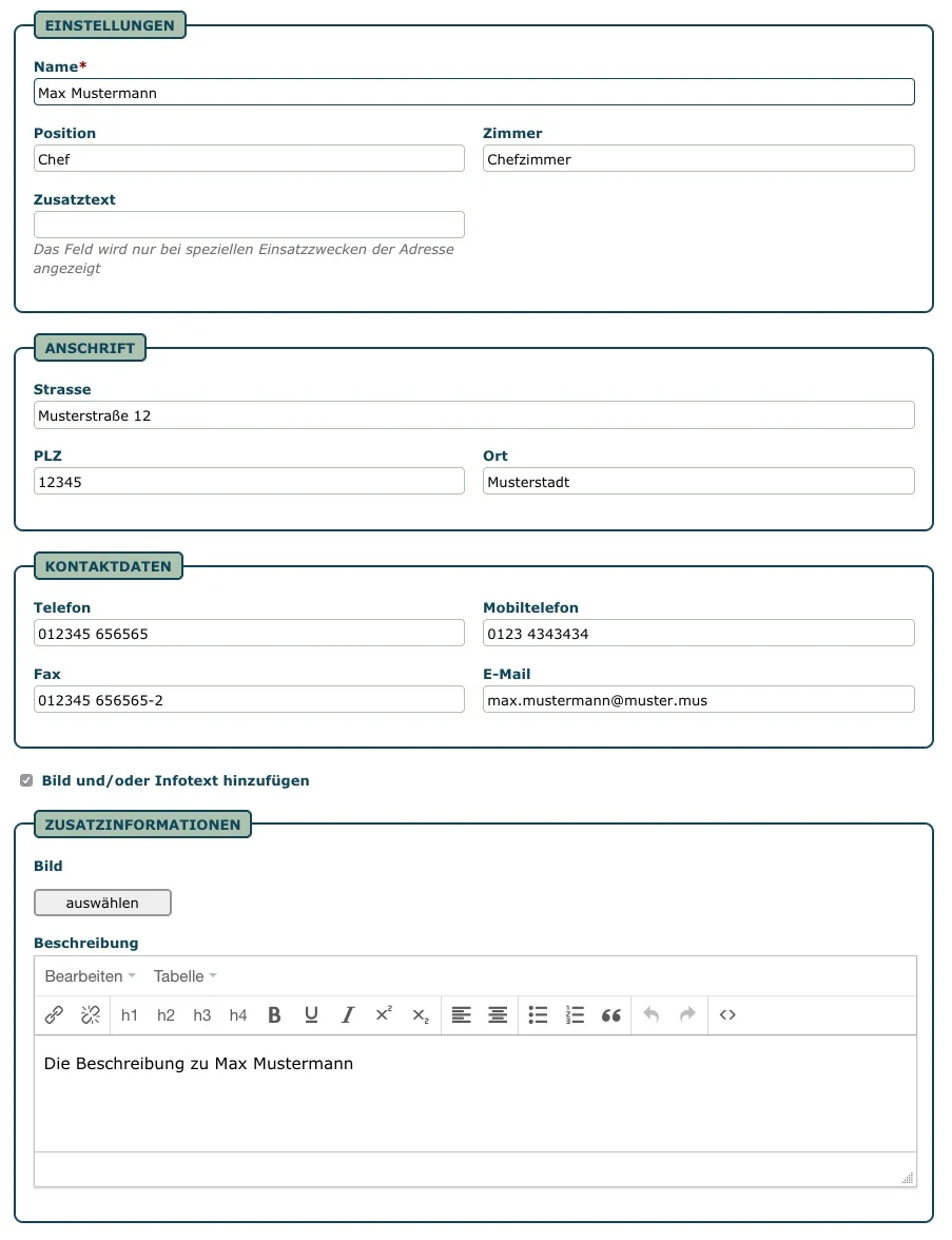 - Inhaltselement: Das Modulelement Adresse stellt standardmäßig alle gepflegten Felder der ausgewählten Adresse dar. Es kann jedoch auch eine explizite Auswahl von Feldern getroffen werden.