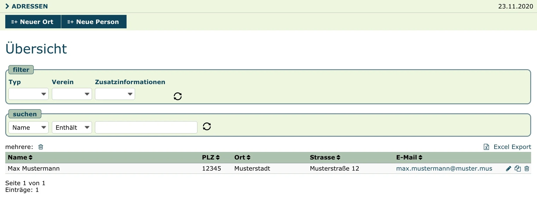 Bei der Neuanlage entscheidet man sich, ob man eine Person oder einen Ort anlegen möchte. Personen verfügen zusätzlich zu Orten über die Felder Position und Zimmer, während bei Orten angegeben werden kann, ob es sich um einen Verein handelt.