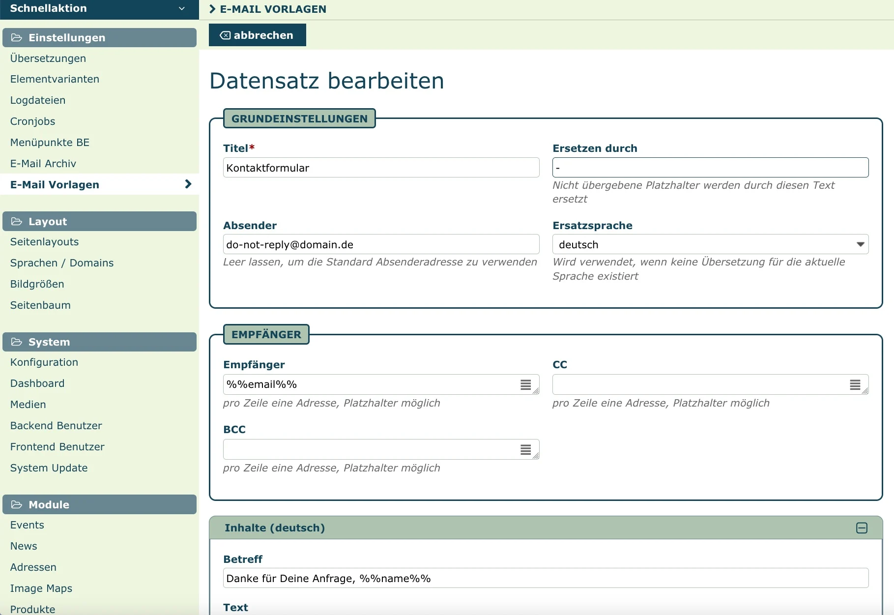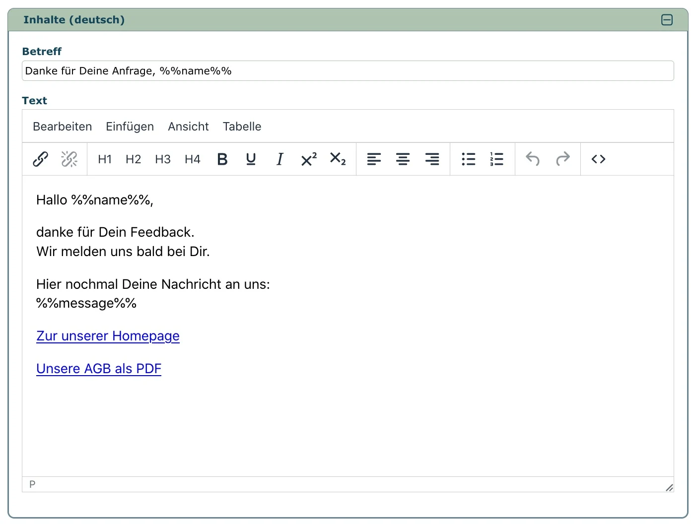 E-Mail Vorlagen können für die Übermittlung von Formulardaten verwendet werden. Die Platzhalter funktionieren nach dem gleichen Schema wie die HTML-Vorlagen, und werden in doppelte Prozentzeichen eingeschlossen.